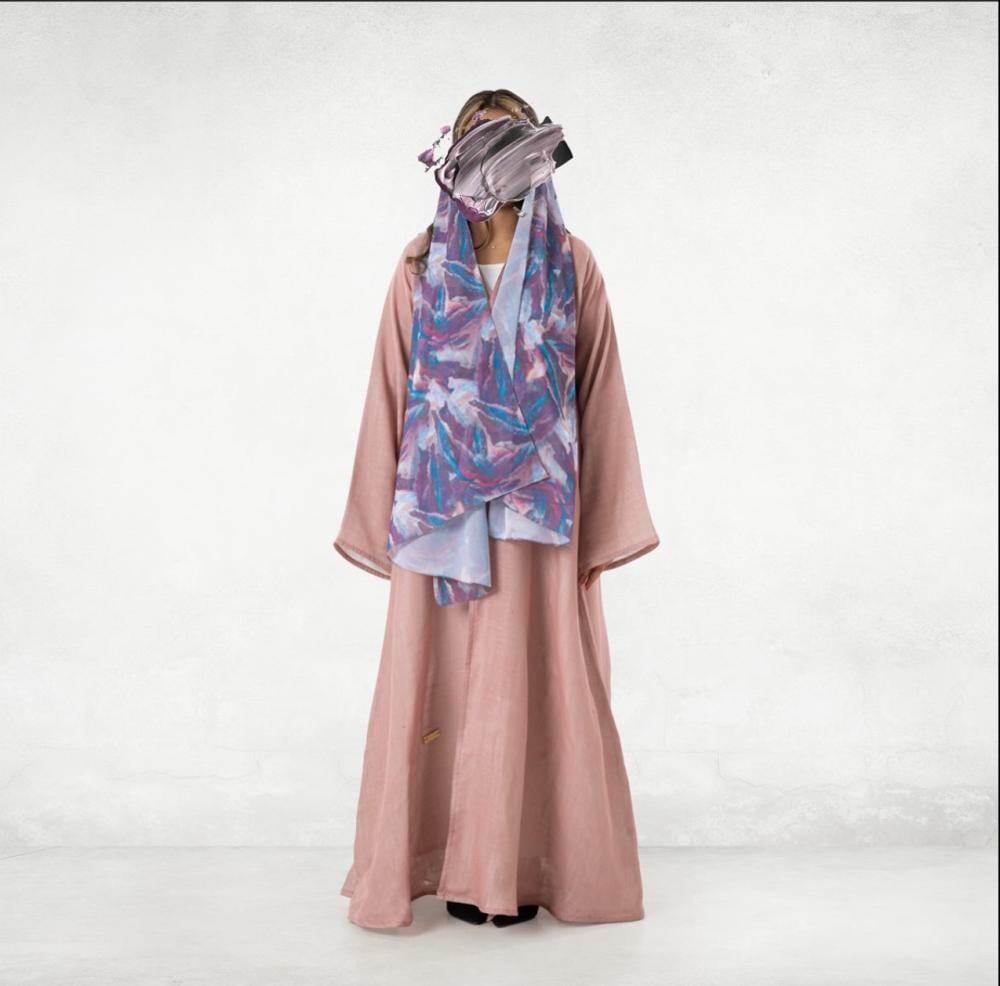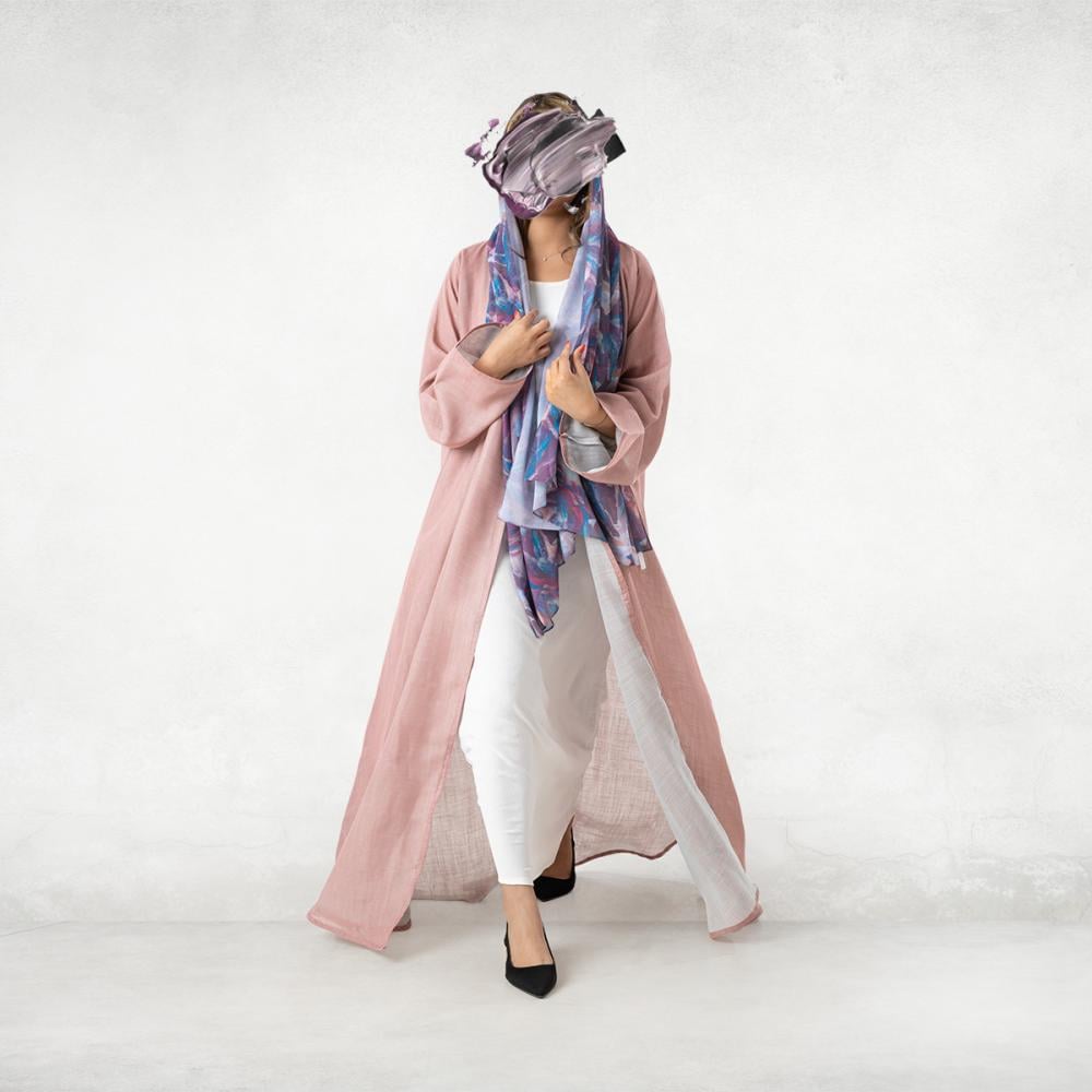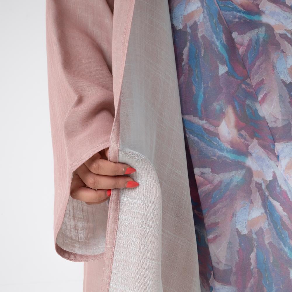 A pink abaya made of luxurious Indian linen in two harmonious colors, with a colorful shawl that adds a touch of vitality and distinction to your daily look or special occasions. Its modern design gives you freedom of movement without compromising elegance and luxury.